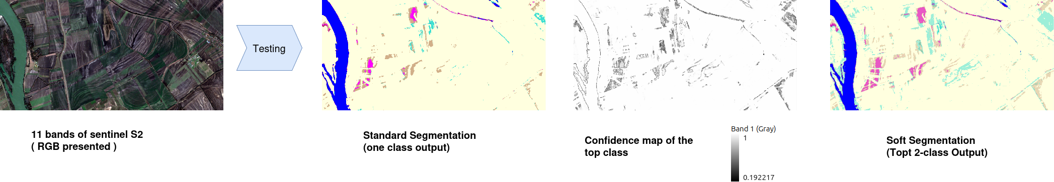 Figures illustrate single-date maps methodology. The first row shows dataset samples, with labeled segmentation classes and assigned IDs. The second row presents test results, comparing hard segmentation, confidence map of the top-1 class, and soft segmentation outputs, which are presented by combining the colors of both top-2 classes. This visualization demonstrates how soft segmentation refines predictions, particularly in smaller yet critical regions of the images where class boundaries change.